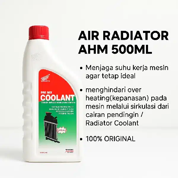 AHM Air Radiator Coolant 500ml. Cairan ini berfungsi mencegah overheat, melindungi sistem pendingin dari karat dan korosi, serta memperpanjang umur pakai radiator dan komponen mesin.