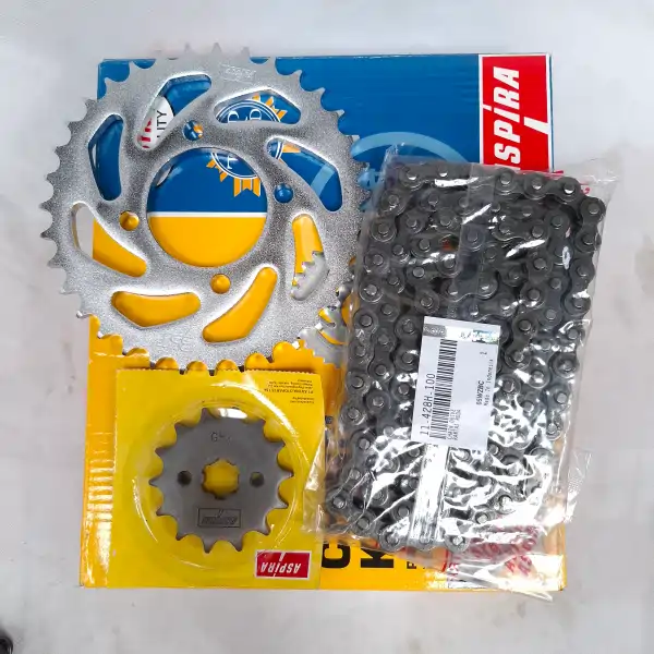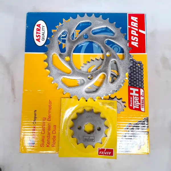 ASPIRA Gear Set Suzuki Smash. Komponen ini menjamin perpindahan tenaga mesin ke roda belakang secara optimal, memberikan performa berkendara yang halus, responsif, dan tahan lama.