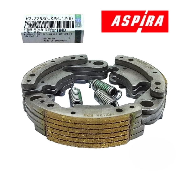 ASPIRA Kampas Otomatis Kopling Karisma Supra X 125. Komponen ini berfungsi sebagai sistem kopling otomatis yang bekerja secara sentrifugal untuk menyalurkan tenaga mesin ke transmisi dengan halus dan responsif, terutama saat akselerasi awal.