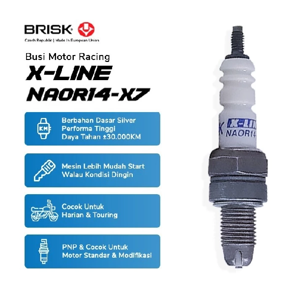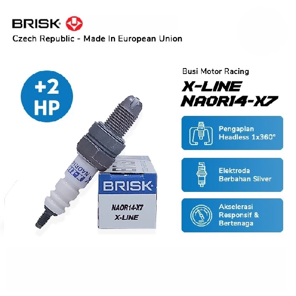 BRISK Busi NAOR14-X7 X-Line Racing. Cocok untuk mesin berperforma tinggi yang membutuhkan respon cepat, tenaga optimal, dan pembakaran sempurna.