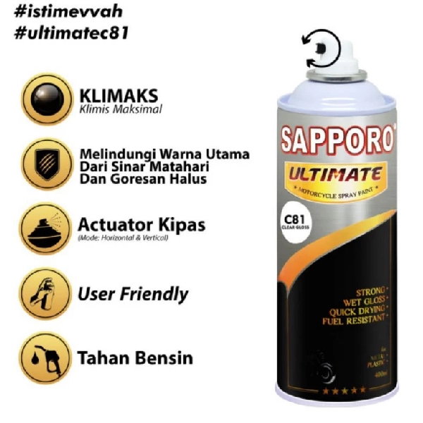 SAPPORO Ultimate adalah cat semprot berkualitas tinggi yang dirancang untuk memberikan hasil pengecatan yang halus, merata, serta memiliki daya rekat kuat pada berbagai jenis permukaan. Dengan formula modern dan pigmen warna premium, Sapporo menjadi pilihan favorit untuk kebutuhan pengecatan harian maupun proyek modifikasi karena mampu menghasilkan tampilan yang profesional tanpa membutuhkan peralatan khusus.