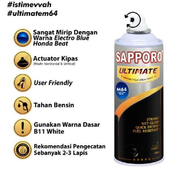 SAPPORO Ultimate  adalah cat semprot berkualitas tinggi yang dirancang untuk memberikan hasil pengecatan yang halus, merata, serta memiliki daya rekat kuat pada berbagai jenis permukaan. Dengan formula modern dan pigmen warna premium, Sapporo menjadi pilihan favorit untuk kebutuhan pengecatan harian maupun proyek modifikasi karena mampu menghasilkan tampilan yang profesional tanpa membutuhkan peralatan khusus.