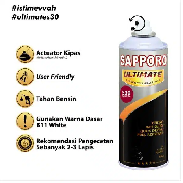 SAPPORO Ultimate adalah cat semprot berkualitas tinggi yang dirancang untuk memberikan hasil pengecatan yang halus, merata, serta memiliki daya rekat kuat pada berbagai jenis permukaan. Dengan formula modern dan pigmen warna premium, Sapporo menjadi pilihan favorit untuk kebutuhan pengecatan harian maupun proyek modifikasi karena mampu menghasilkan tampilan yang profesional tanpa membutuhkan peralatan khusus.