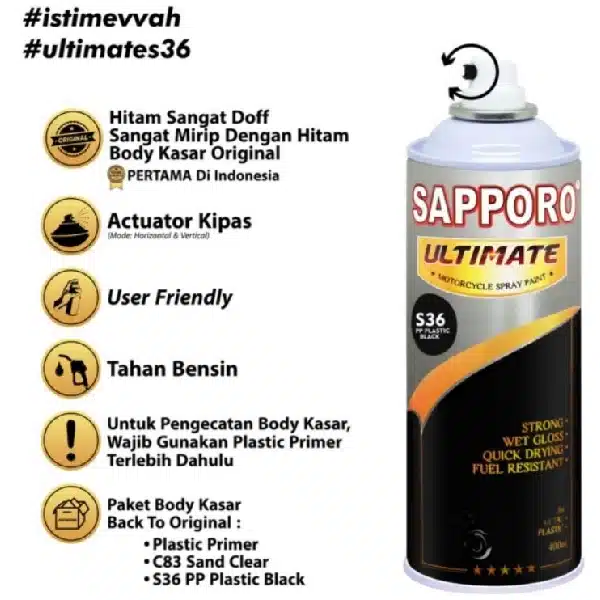 SAPPORO Ultimate adalah cat semprot berkualitas tinggi yang dirancang untuk memberikan hasil pengecatan yang halus, merata, serta memiliki daya rekat kuat pada berbagai jenis permukaan. Dengan formula modern dan pigmen warna premium, Sapporo menjadi pilihan favorit untuk kebutuhan pengecatan harian maupun proyek modifikasi karena mampu menghasilkan tampilan yang profesional tanpa membutuhkan peralatan khusus.